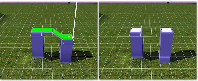 This technique also works if you wanted to make walls higher than the standard 12 clicks. In the next two images you can see how I've raised the height of the one tile room, this time again by 3 clicks thereby adding 1/4 of additional height. I did this by placing a one tile room on terrain raised by 3 clicks and leveling from it to the other making the one tile room on the right 15 clicks high in total. Literally the sky is the limit for raising wall height, but there is a limit to how much you can lower the height of a wall and that limit is 3 clicks. You could go lower in the Sims 2, but in Sims 3 it is no longer possible to the best of my knowledge.